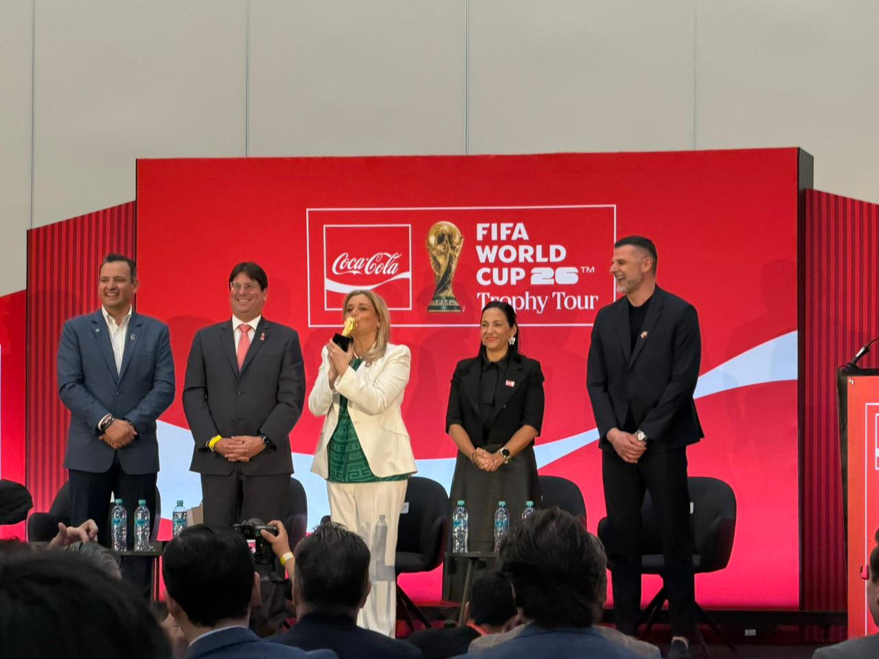 Durante el evento realizado en el Centro de Convenciones y Exposiciones de Chihuahua, la mandataria estatal presentó el trofeo ante asistentes y destacó que esta visita forma parte del recorrido promocional que realiza el símbolo del máximo torneo de fútbol a nivel mundial.