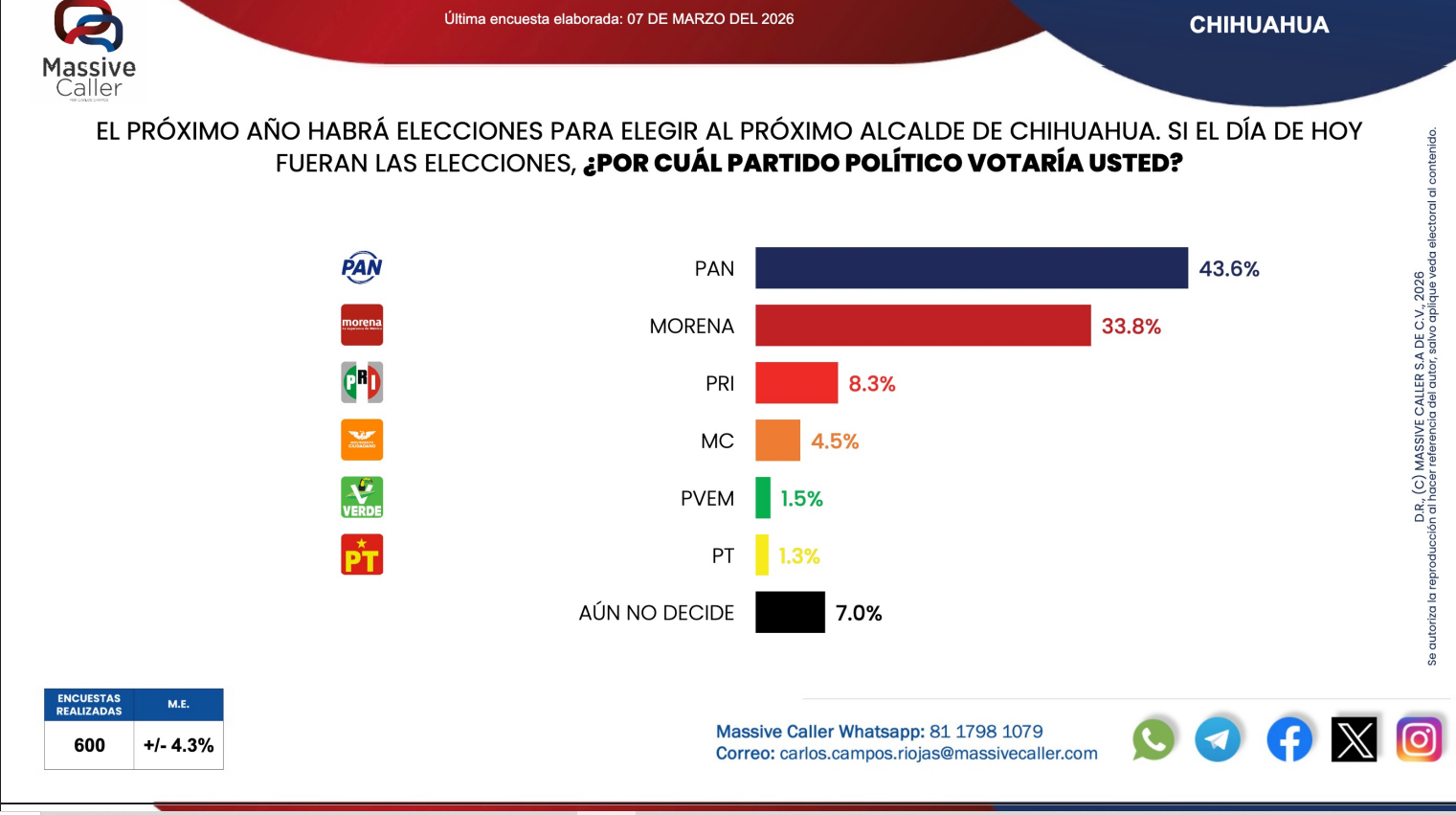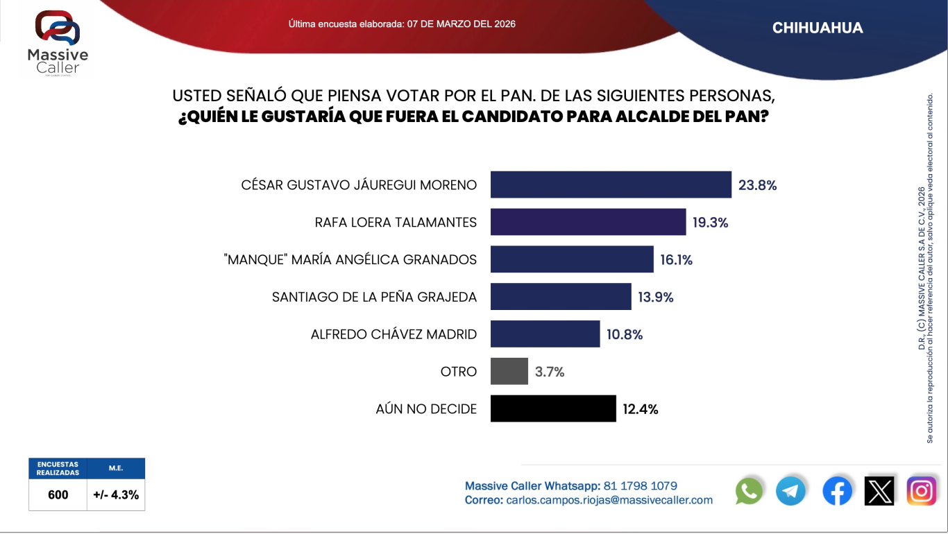 La medición de Massive Caller se realizó mediante 600 encuestas con un margen de error aproximado de ±4.3%, como parte de su seguimiento periódico sobre escenarios electorales rumbo a las elecciones municipales de 2027 en Chihuahua.