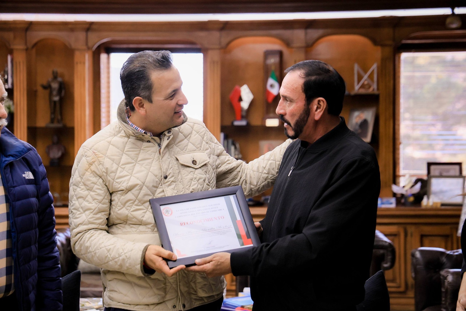 Chihuahua, Chih.- El alcalde Marco Bonilla recibió a manos de la Confederación Nacional Campesina (CNC) un reconocimiento para agradecer el apoyo que se le ha brindado al campo desde el Gobierno Municipal.
