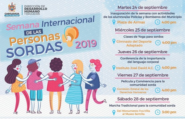 El próximo 30 de septiembre; último domingo del mes, se conmemora el Día Internacional de la Persona Sorda a nivel mundial, es por ello que el Gobierno Municipal de Chihuahua, a través de la Dirección de Desarrollo Humano y Educación, invita a la comunidad a participar en las actividades que diversas asociaciones chihuahuenses que trabajan por y para personas con discapacidad auditiva, así como la propia comunidad sorda, tienen preparadas para realizarse la semana del 24 al 28 de septiembre.