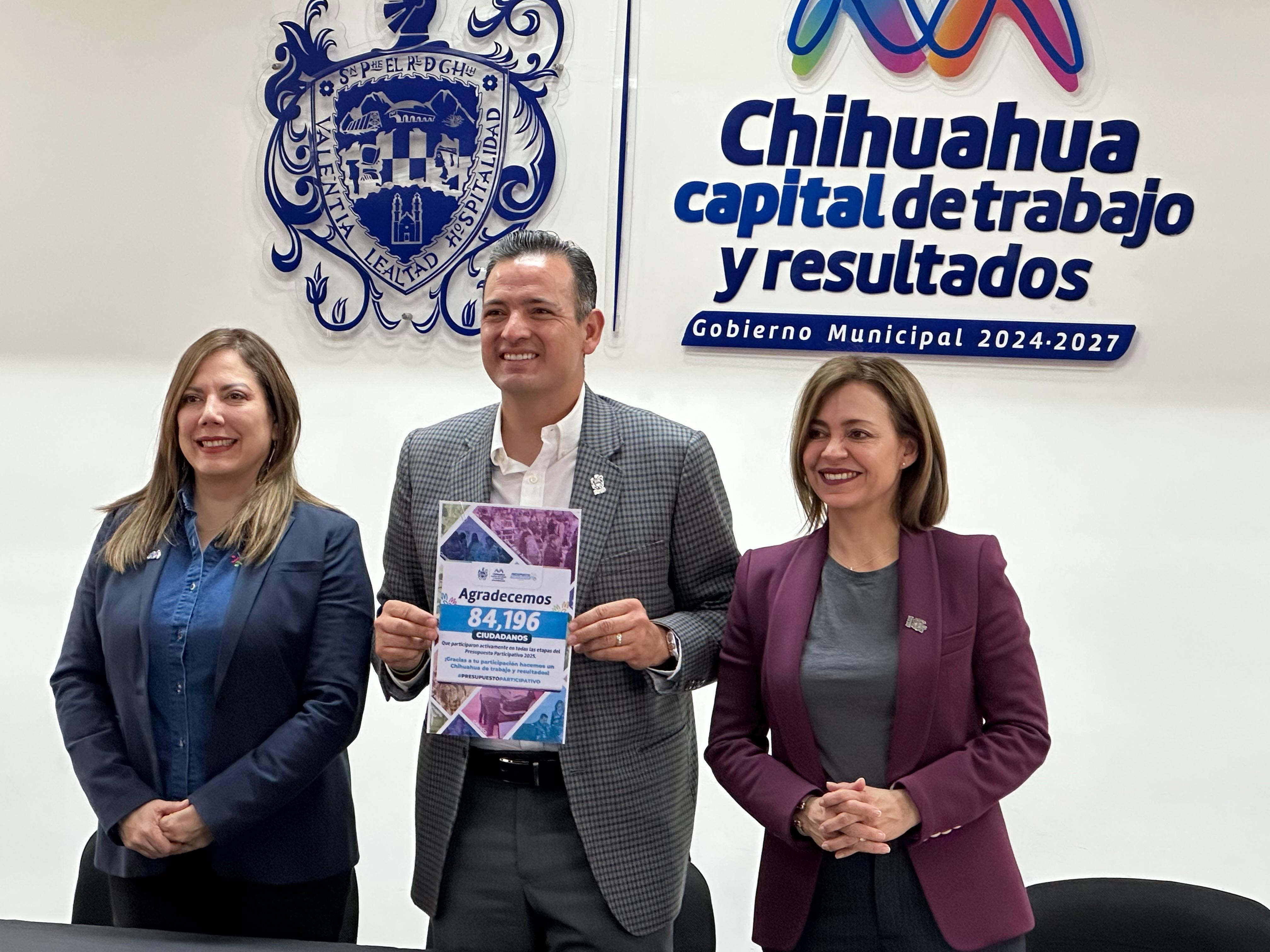 Chihuahua.- El alcalde Marco Bonilla Mendoza dio a conocer los resultados de la votación del Presupuesto Participativo 2025, en compañía de la coordinadora del Presupuesto Participativo, Laura Contreras, quién agradeció a los más de 84 mil ciudadanos que salieron a esta jornada, que se reportó sin alguna incidenci, pero si con una gran fluencia en los diversos centros que fueron instalados.