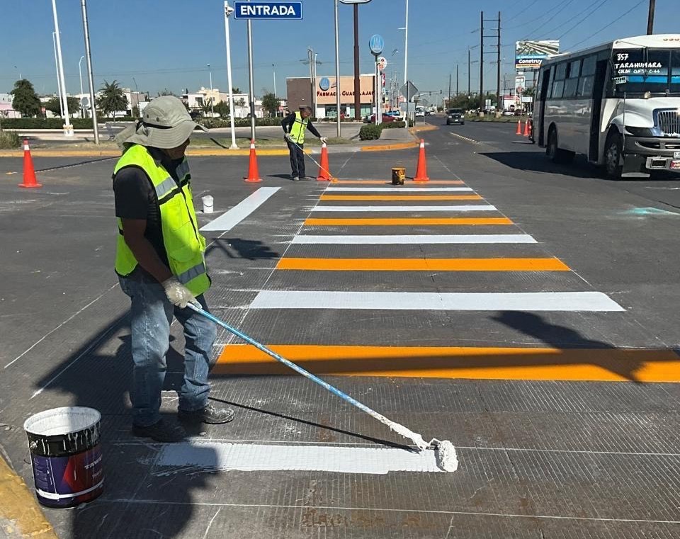 Durante el presente año, se aplicaron 22 mil 817 metros cuadrados de pintura vial, lo que equivale a 495 pasos peatonales, 576 líneas de frenado y 159 altos al piso. De manera adicional, se pintaron 33 mil 250 metros lineales en calles y avenidas de la ciudad de Chihuahua, y se colocaron 398 señalamientos verticales, fortaleciendo el orden y la prevención de accidentes en la vía pública.