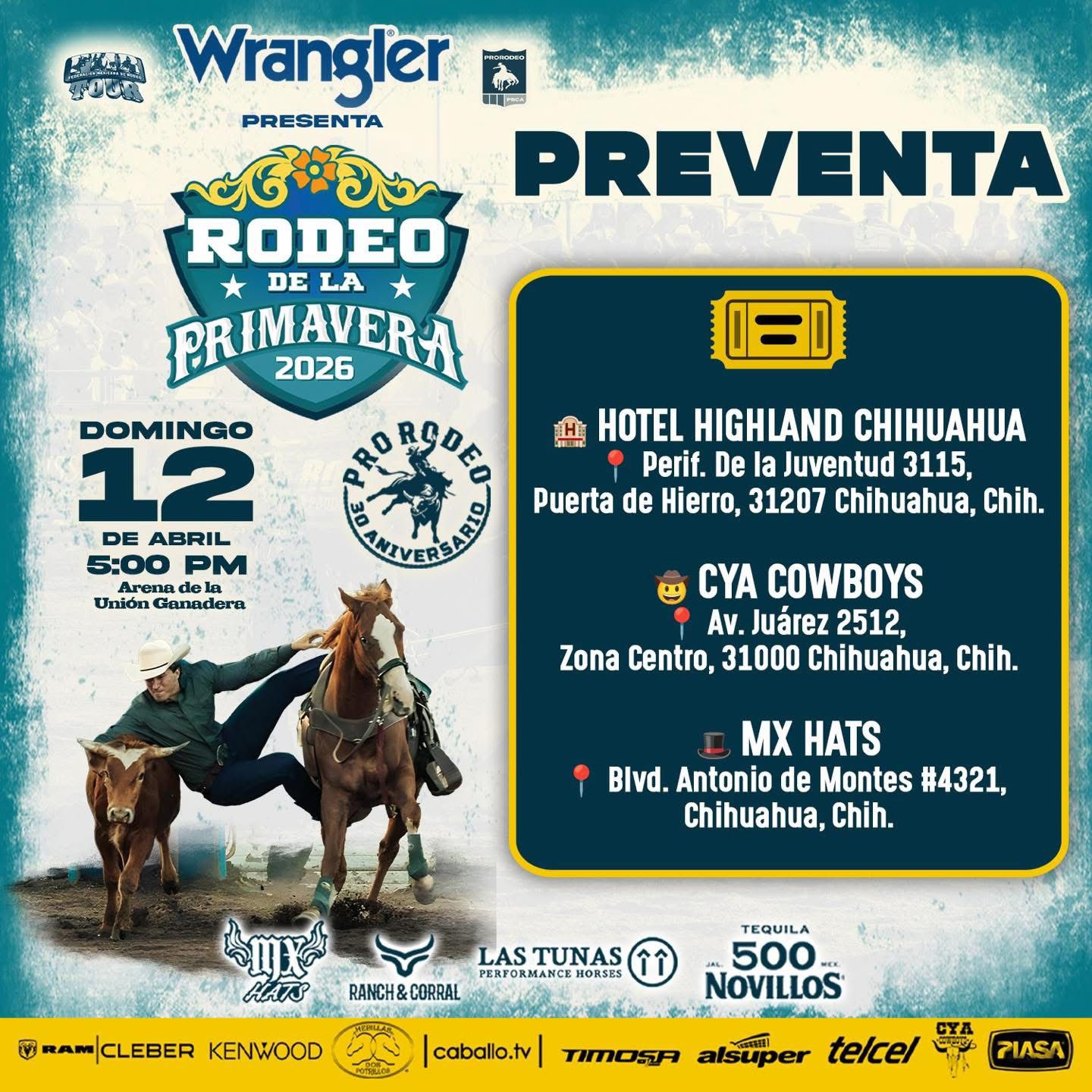 La preventa se encuentra disponible en: Hotel Highland Chihuahua, CYA Cowboys y en MX Hats.