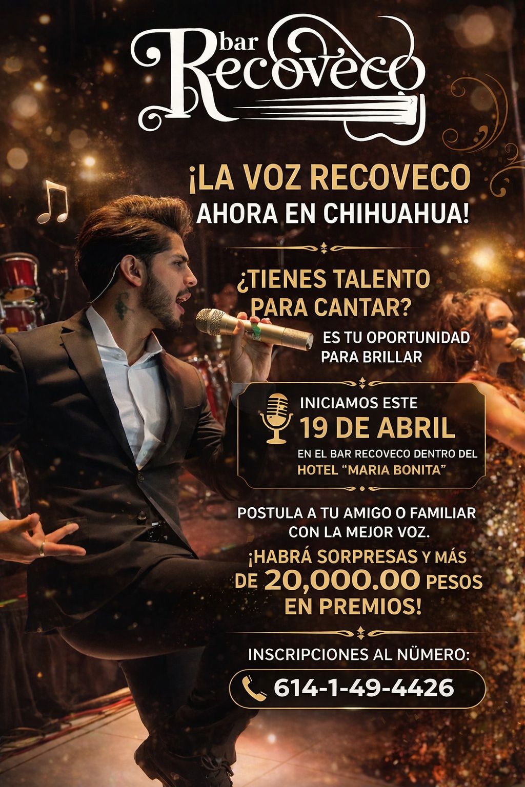 Chihuahua.- La voz Recoveco dará inicio el próximo 19 de abril en el bar Recoveco, ubicado dentro de las instalaciones del “Hotel María Bonita”.