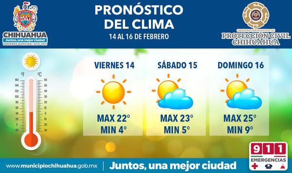 La Coordinación Municipal de Protección Civil informa que según el pronóstico del tiempo, habrá de continuar el clima templado durante el día este fin de semana, previéndose para mitad de semana una nueva onda fría que podría traer temperaturas inferiores a 0° C, principalmente por la madrugada.