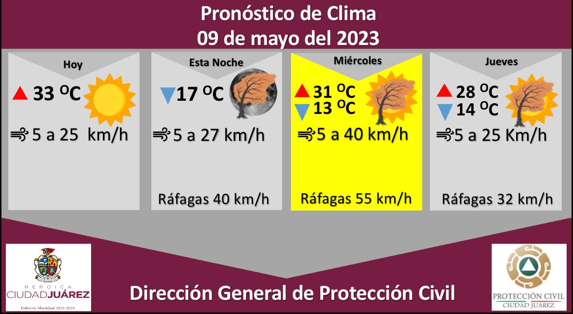 Juárez.- La Dirección General de Protección Civil, con base en informes del Servicio Meteorológico Nacional, pronostica un martes soleado con fuertes ráfagas de viento por la tarde, las cuales alcanzarán los 40 kilómetros por hora, informó Roberto Briones Mota, titular de la dependencia.