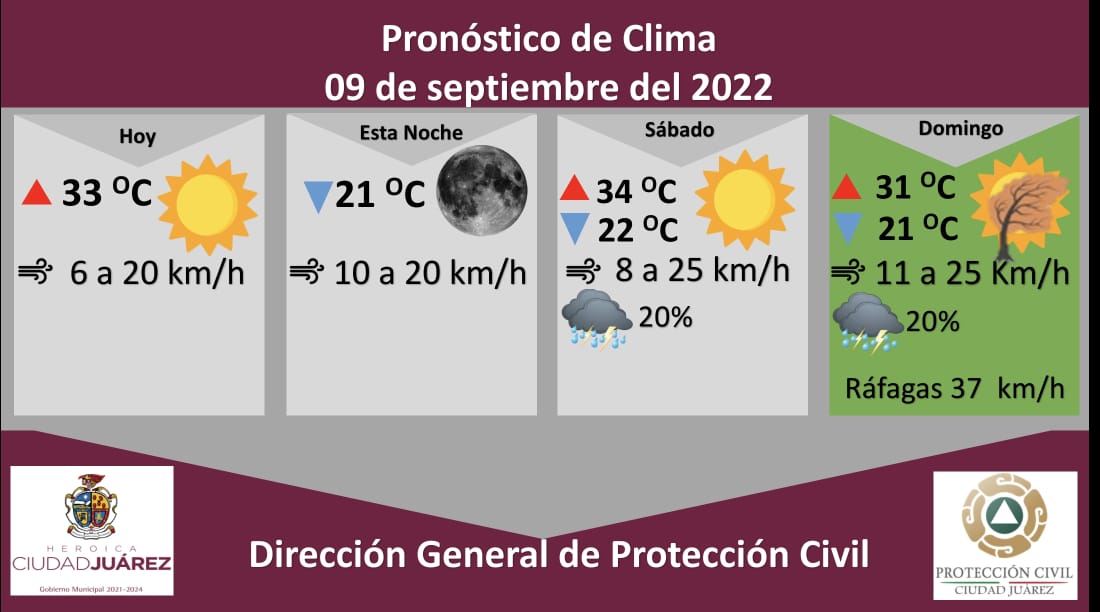 Para mañana sábado hay un 20 por ciento de probabilidad de lluvia, se pronostica un día soleado con una temperatura máxima de 34 °C y mínima de 22 °C, la velocidad del viento será de 8 a 25 kilómetros por hora.