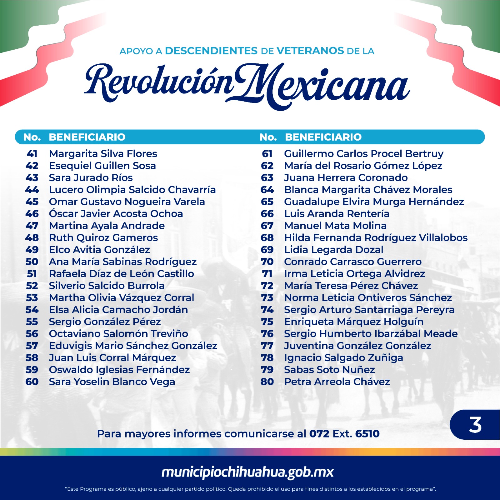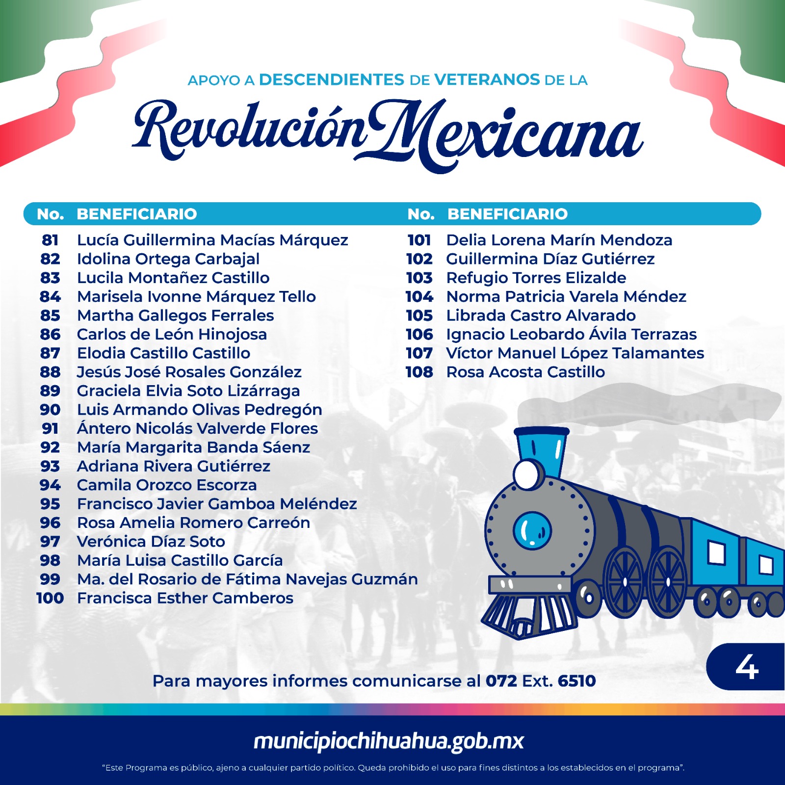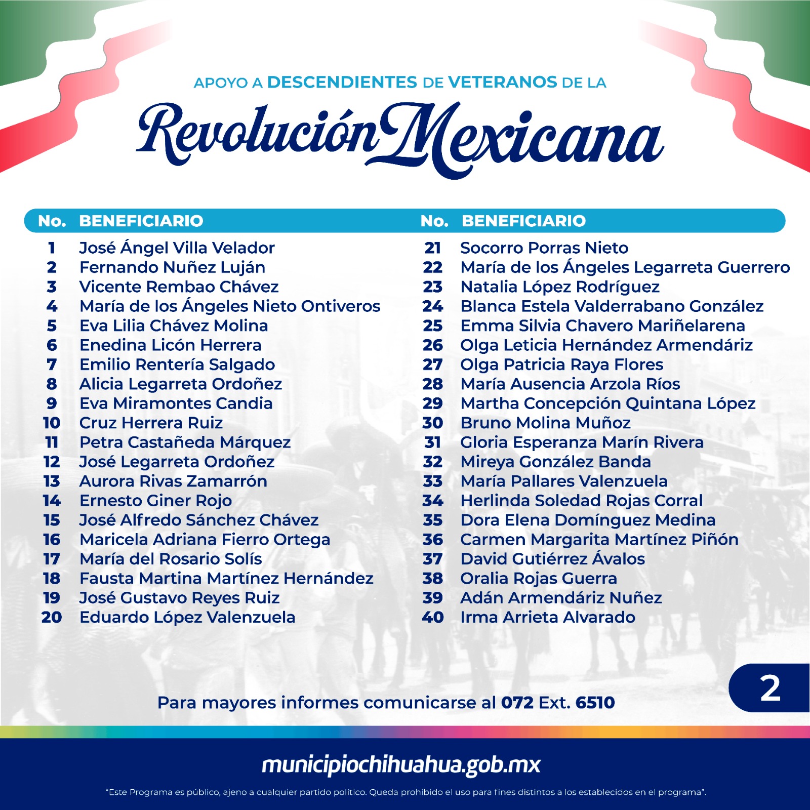 Chihuahua.- El Gobierno Municipal, a través de la Dirección de Desarrollo Humano y Educación, da a conocer el padrón de los 108 beneficiarios del programa “Apoyo a Descendientes de Veteranos de la Revolución”.