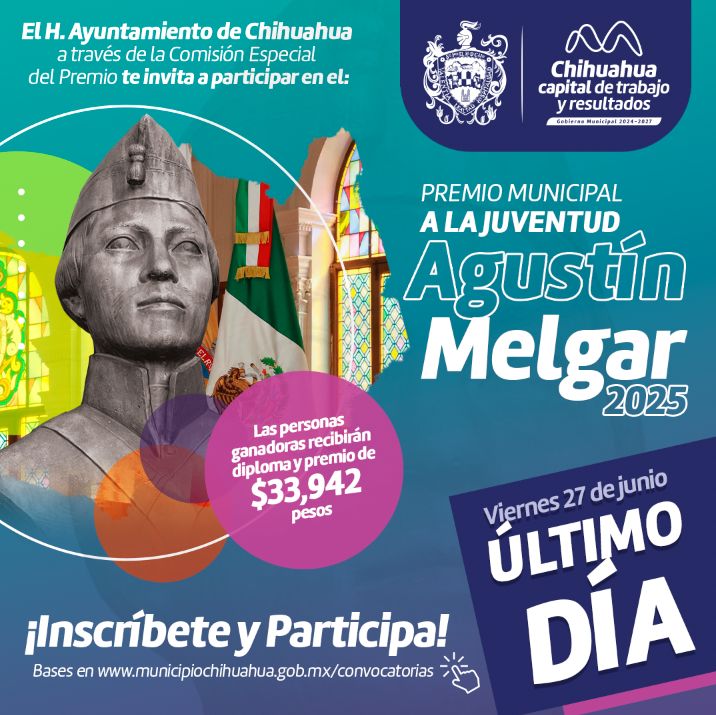 Chihuahua.- El Ayuntamiento, a través de la Comisión Especial del Premio, invitan a las y los jóvenes a participar en el Premio Municipal a la Juventud “Agustín Melgar 2025”, que cierra inscripciones el 27 de junio.