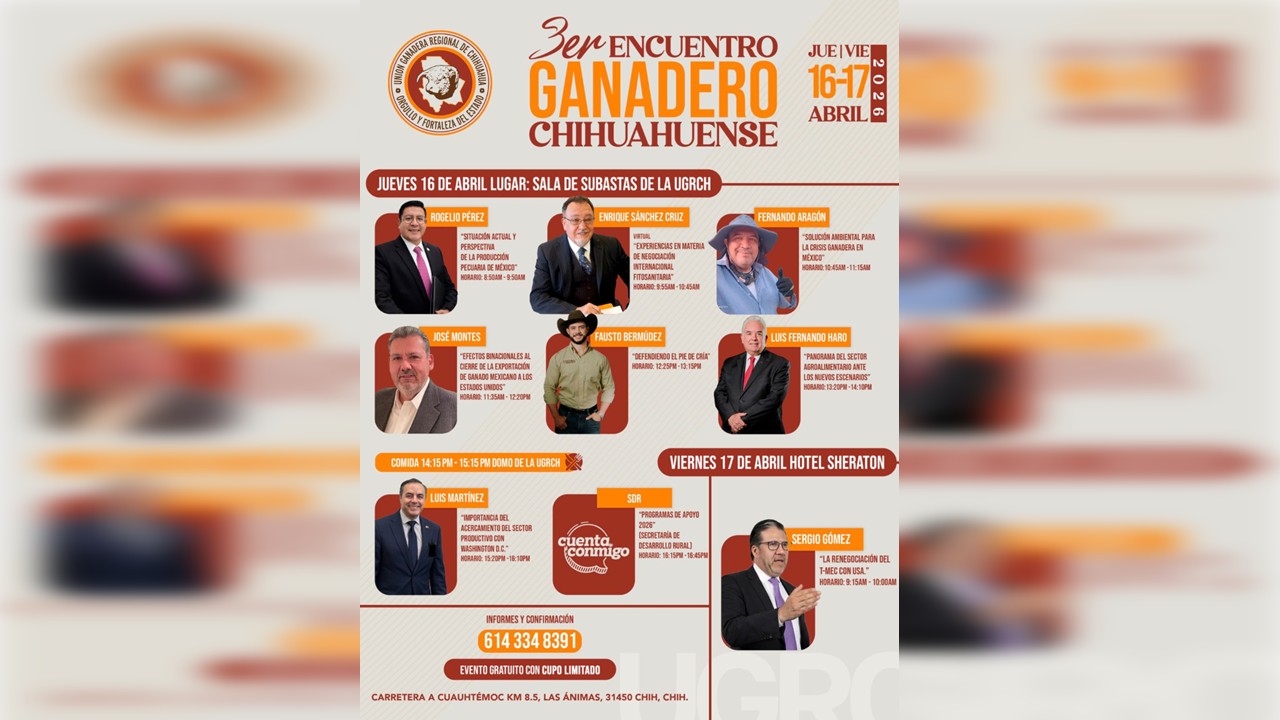 Chihuahua.- La Unión Ganadera Regional de Chihuahua (UGRCH) realizará la tercera edición del Encuentro Ganadero Chihuahuense, donde se contará nuevamente con investigadores y especialistas de talla nacional e internacional, los días 16 y 17 de abril.