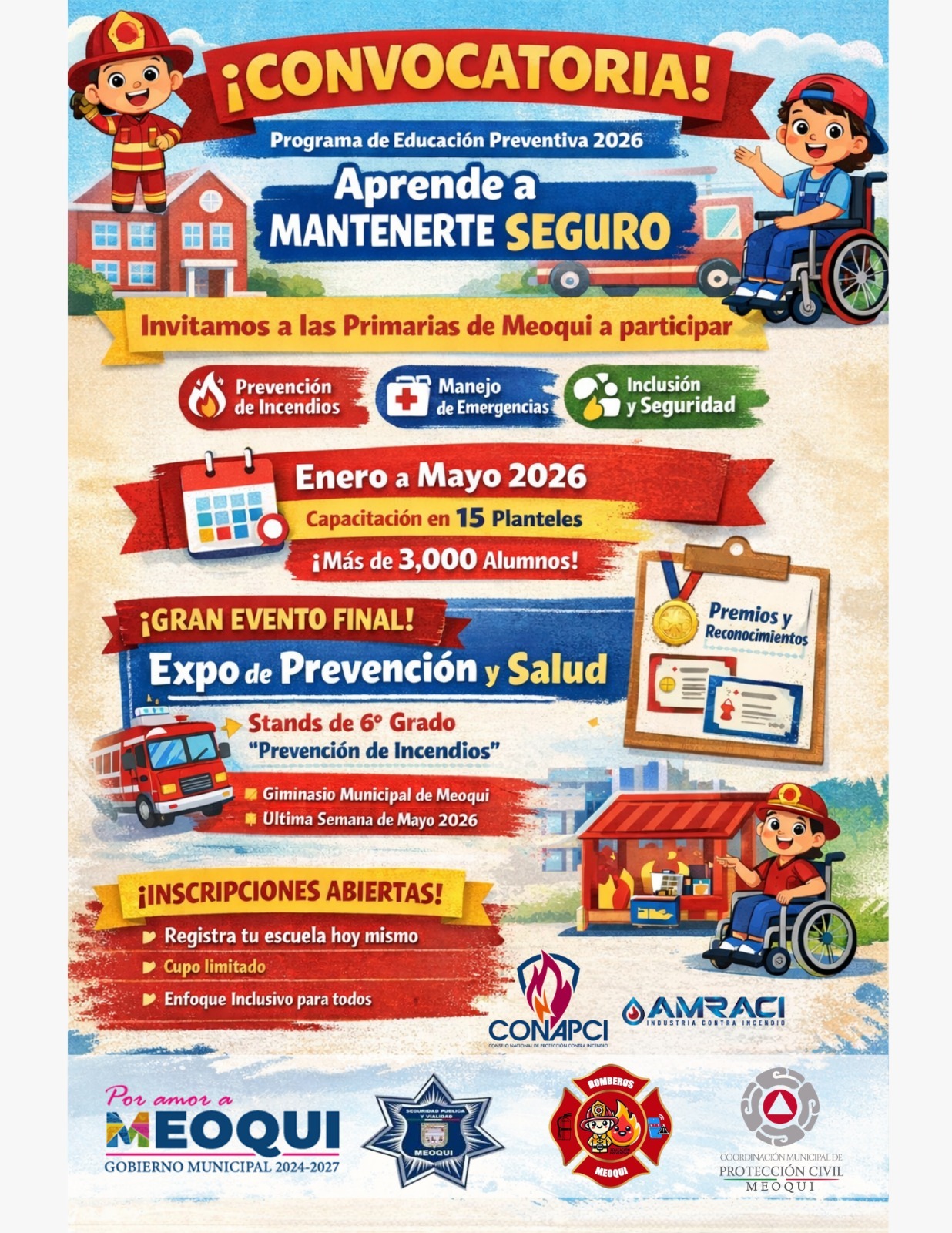 Martín Orona, inspector de Protección Civil y Bomberos, recordó que el programa “Aprende a Mantenerte Seguro” tiene como finalidad fomentar el autocuidado y la cultura de la prevención en niñas y niños, especialmente ante el riesgo de incendios. Durante el ciclo escolar enero–mayo, esta capacitación se imparte en 10 escuelas del municipio, mencionando que como parte de la graduación se realizará esta Expo, donde las escuelas participantes demostrarán lo aprendido mediante la instalación de sus stands.