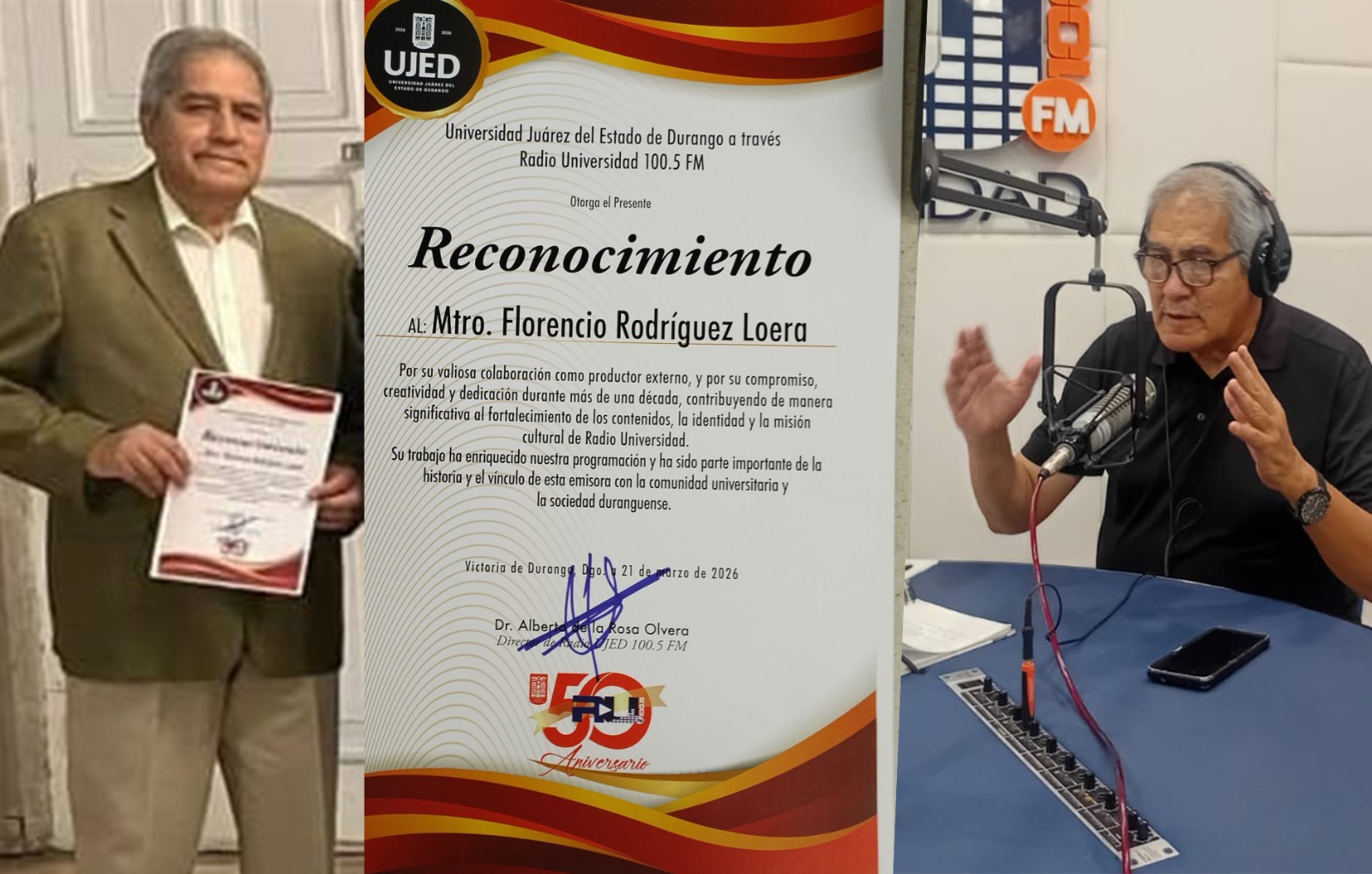 Meoqui.- El maestro Florencio Rodríguez Loera, originario de Meoqui, Chihuahua, fue reconocido por la Universidad Juárez del Estado de Durango por su destacada trayectoria como productor y conductor de un programa radiofónico en Radio Universidad, labor que ha desempeñado durante más de una década.