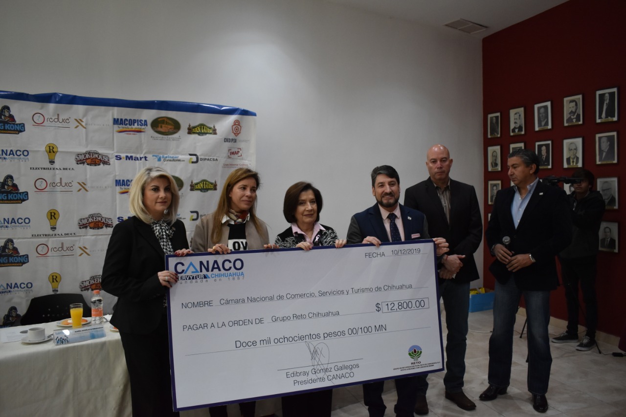 La Cámara Nacional de Comercio, Servicios y Turismo, en conjunto con la Dirección de Desarrollo Económico y Turístico de Chihuahua, hizo entrega este día del cheque simbólico a Grupo RETO, una asociación civil que se dedica a apoyar a mujeres que viven un proceso de cáncer, y sus familias.