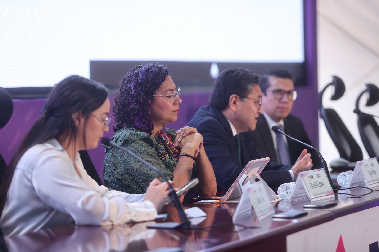 La presidenta de la Comisión de Quejas y Denuncias del INE, Rita Bell López Vences, acompañada del Encargado de la Unidad Técnica de lo Contencioso Electoral (UTCE), Hugo Patlán Matehuala, explicaron que el Consejo General consideró necesario el dictado de una medida cautelar, para inhibir la distribución de acordeones impresos.