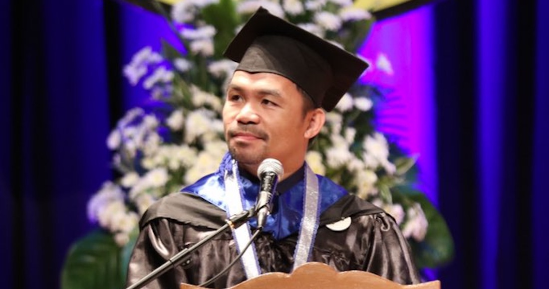 A sus 40 años, Manny Pacquiao consiguió su título de escolaridad superior al recibirse en la Universidad de Mataki, lugar de nacimiento del boxeador, en la licenciatura de Ciencias Políticas y Administración de Gobierno, ya que además de dedicar su vida al pugilismo profesional, éste es Senador en Filipinas.
