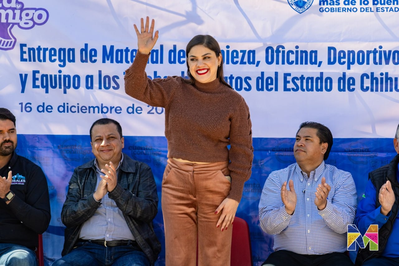 Meoqui.- La alcaldesa de Meoqui, Miriam Soto, acudió a la entrega de equipamiento para los Telebachilleratos de Guadalupe Victoria, Estación Consuelo y Felipe Ángeles, esto gracias a la suma de esfuerzos con la gobernadora Maru Campos, la cual, consiste en material de limpieza, para oficina, deportivo, equipo y mobiliario, siendo acciones que vienen a fortalecer la educación y fortalecimiento de las juventudes meoquenses.