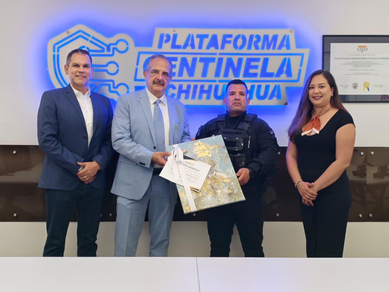 Chihuahua.- El presidente de la Cámara Nacional de Comercio (CANACO) Chihuahua, Alejandro Lazarotto, entregó un reconocimiento al agente de la fuerza especial SWAT de la Secretaría de Seguridad Pública del Estado (SSPE), Fernando López Minjarez, por su destacada labor operativa que lo llevó a ser distinguido como Policía del Año 2025, nombramiento previamente otorgado por el secretario Gilberto Loya.