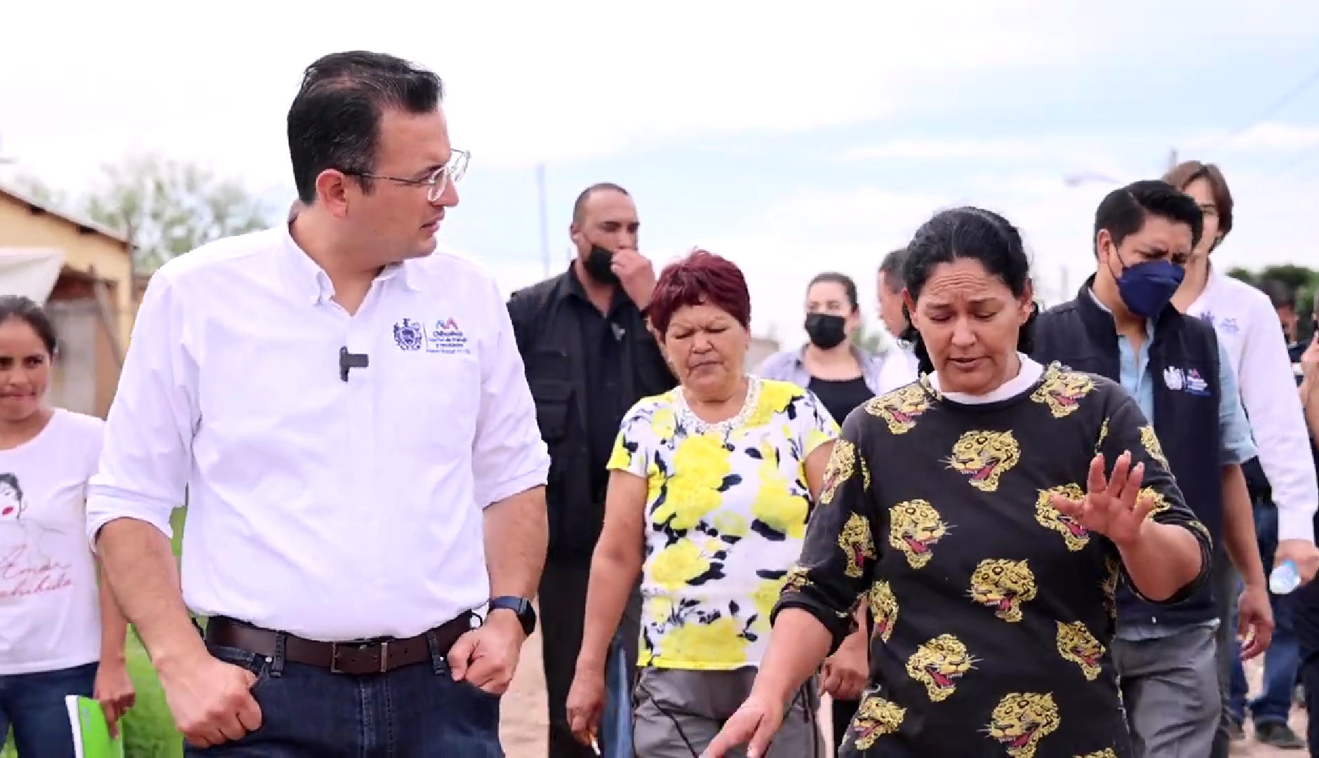 Chihuahua.- El alcalde Marco Bonilla Mendoza, hizo un recorrido por las calles de la colonia Valle Dorado para detectar las zonas que se han visto más afectadas por las lluvias y platicar de manera directa con los vecinos para buscar soluciones a sus necesidades.