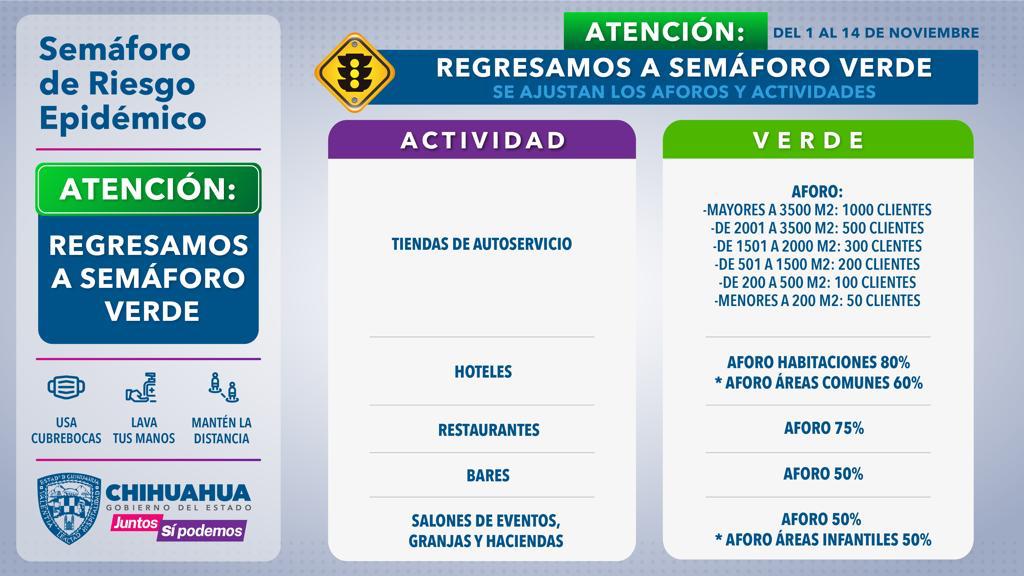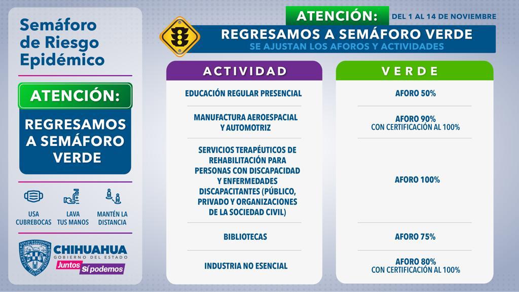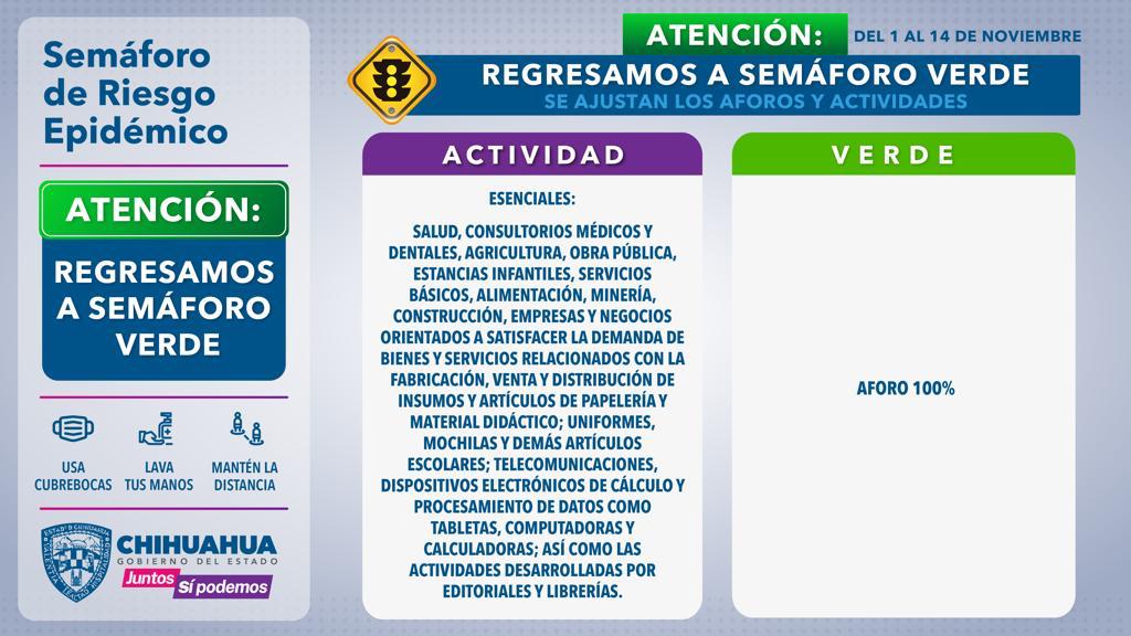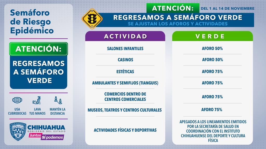 Chihuahua.- A partir del 1 de noviembre el estado de Chihuahua pasará a semáforo epidemiológico color verde.Por lo que se exhorta a la ciudadanía a reforzar las medidas preventivas para evitar un retroceso en los indicadores que permiten la reapertura económica.