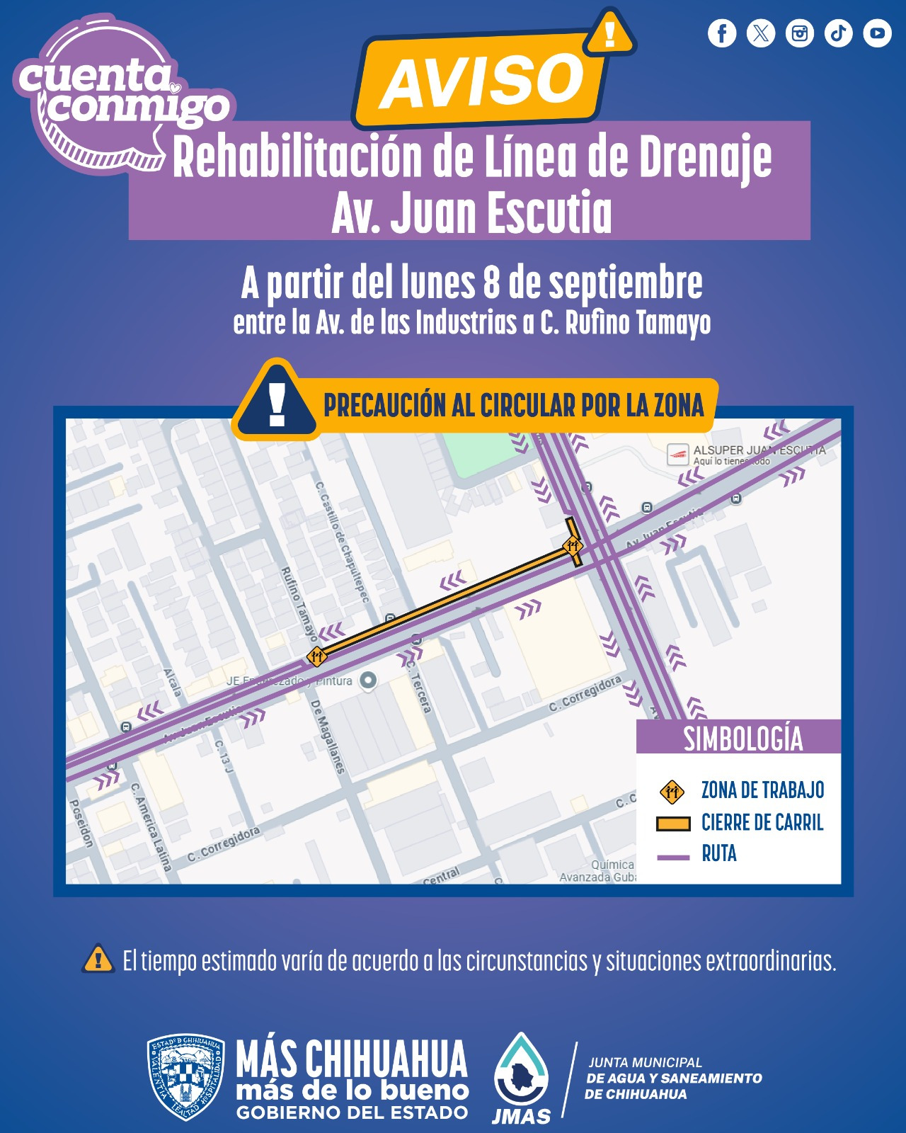 Chihuahua, Chih.- La Junta Municipal de Agua y Saneamiento (JMAS) de Chihuahua informó que este lunes 8 de septiembre, realizará los trabajos de rehabilitación de línea de drenaje en la avenida Juan Escutia, entre De las Industrias y calle Rufino Tamayo.