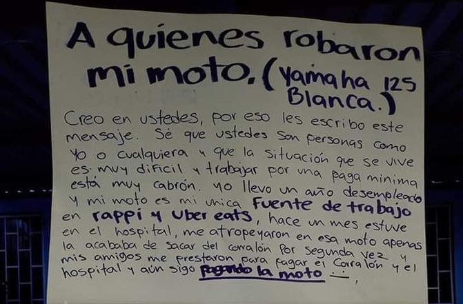 La cuenta de Twitter @repartidorr publicó el cartel, donde el hombre también explica que la moto era su única fuente de empleo para Rappi y Uber Eats, y señaló que aún está pagándola, detalló el diario Excélsior.