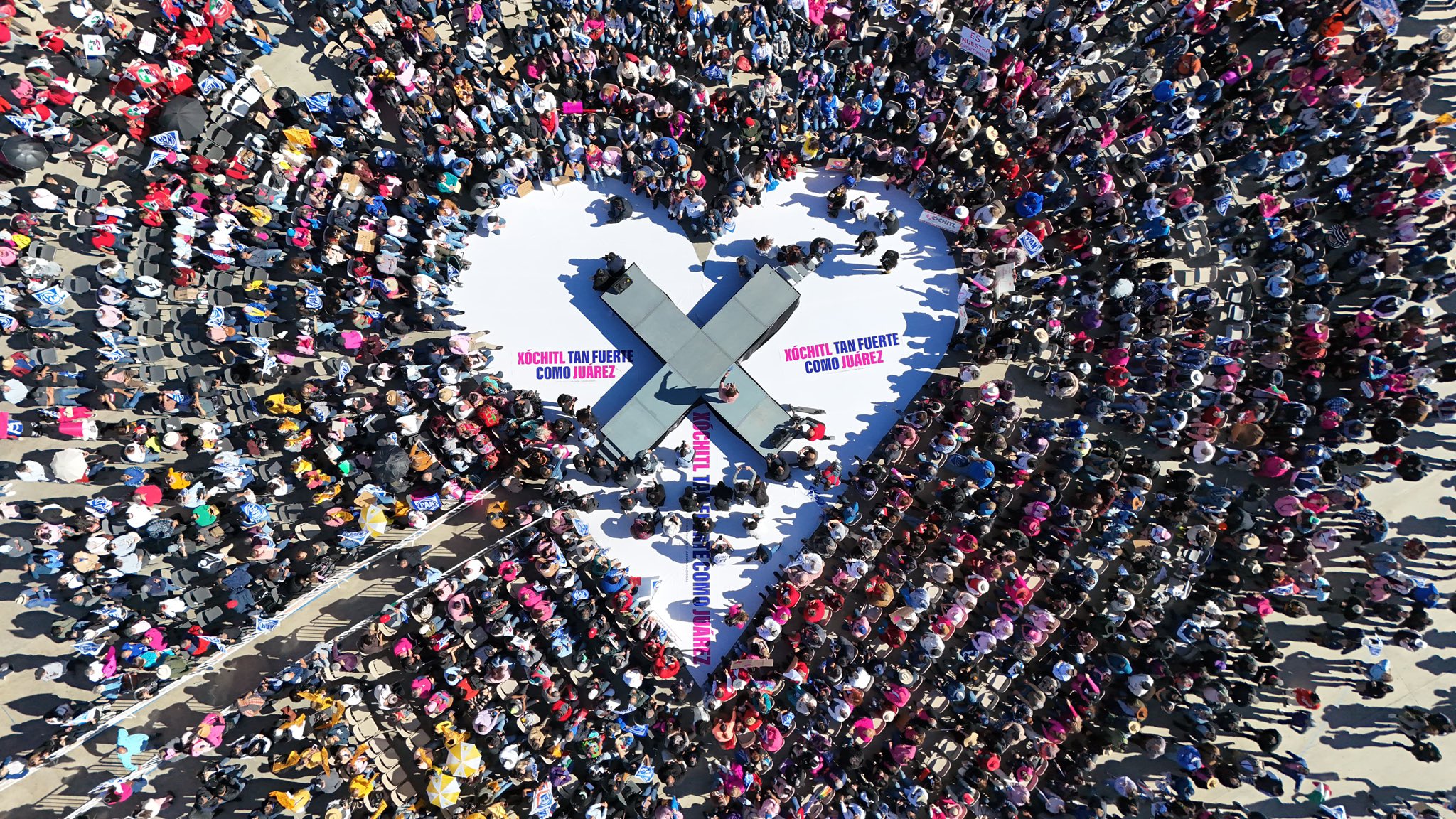 Ahí conformaron un corazón que encerró a un escenario en forma de equis, desde donde emitió su discurso a los militantes de los tres partidos que la postularon: PRI, PAN y PRD.