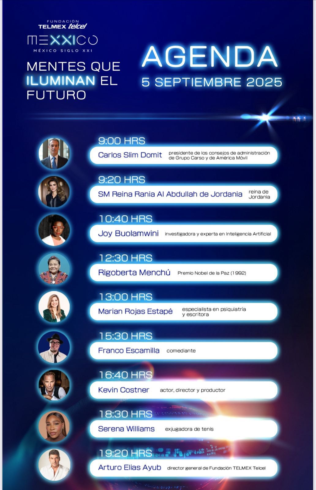 También estarán Joy Buolamwini: Investigadora y experta en Inteligencia Artificial; Rigoberta Menchú, premio Nobel de la Paz en 1992; Marian Rojas Estapé, psiquiatra y escritora;Franco Escamilla, Comediante; Kevin Costner, actor, director y productor; Serena William, exjugadora de tenis; Arturo Elías Ayub, Director general de Fundación TELMEX Telcel.