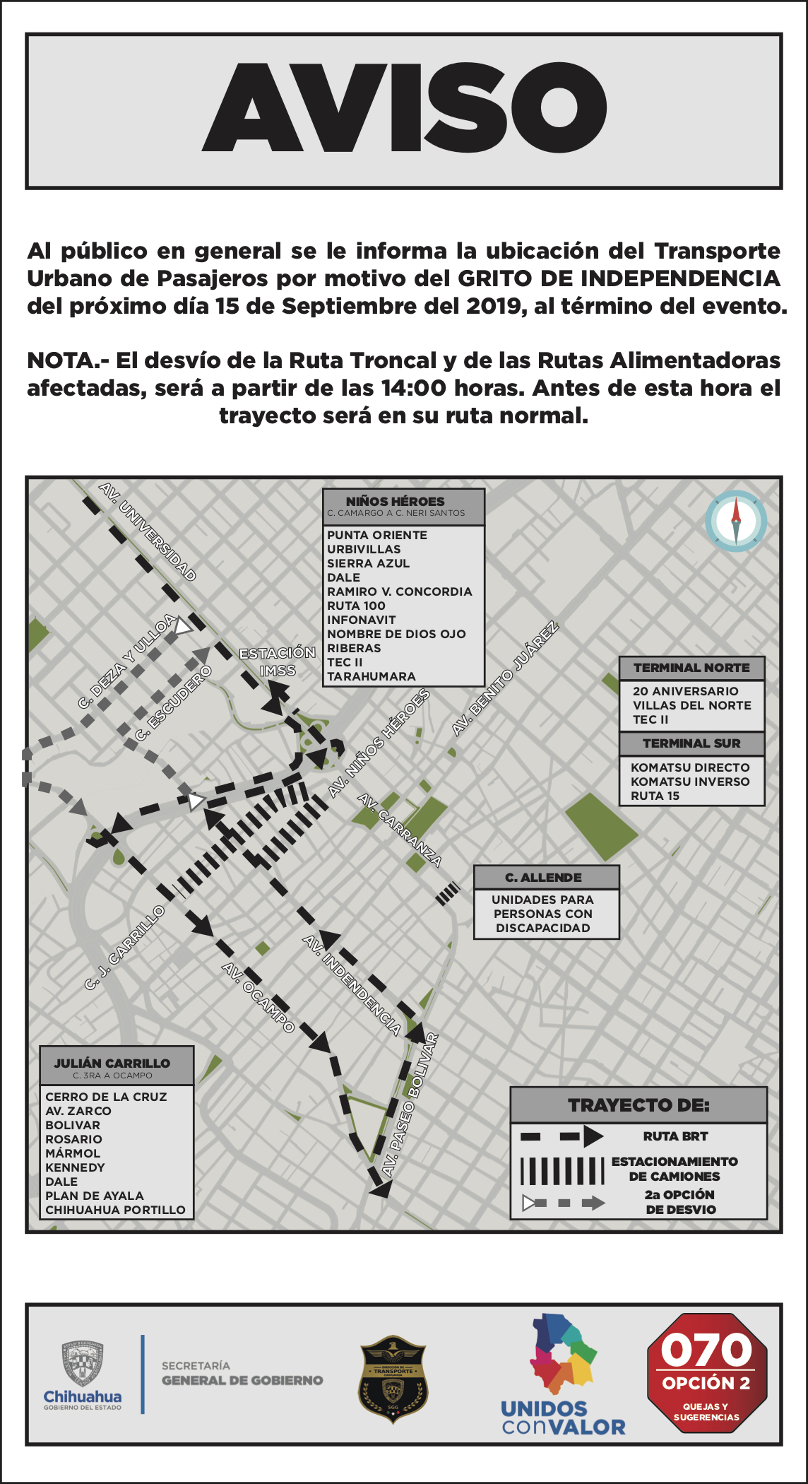 La Dirección de Transporte del Estado de Chihuahua dio a conocer los cambios en los recorridos de las rutas que tendrán lugar con motivo de la celebración de la Independencia, a partir de las 14:00 horas de este domingo 15 de septiembre, hasta el lunes 16 cuando haya terminado el desfile.
