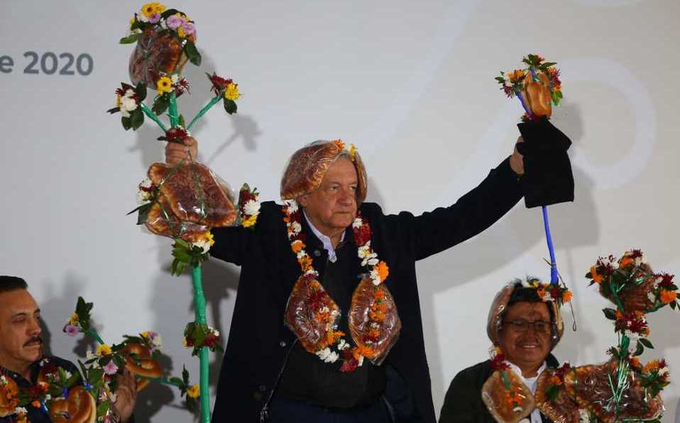 Antes, López Obrador fue investido con accesorios honoríficos de la comunidad otomí que constan de una diadema y un collar con bolsas con pan y un bastón de mando con flores.