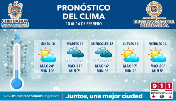 El Gobierno Municipal, a través de la Coordinación de Protección Civil, informa sobre el pronóstico meteorológico para esta semana en el municipio de Chihuahua en donde se espera que prevalezcan vientos, lluvias débiles por la madrugada y temperatura mínima de 2 grados centígrados, debido al frente frío número 39 y la novena tormenta invernal.