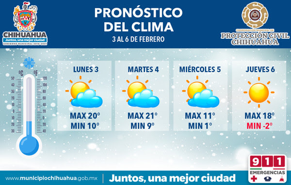 Estrada Castillo añadió que es importante tener en cuenta las debidas precauciones para evitar enfermedades, por lo que exhortó a los chihuahuenses a abrigarse de manera adecuada, y evitar cambios bruscos de temperatura, así como mantenerse al pendiente de los avisos preventivos de las diferentes dependencias.