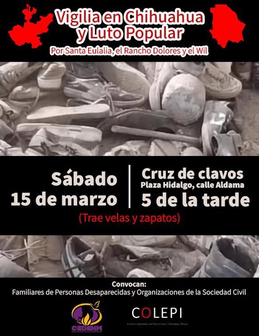El estado de Chihuahua se unirá a la Vigilia y Luto Nacional por las víctimas de los crematorios clandestinos de Teuchitlán, Jalisco. La convocatoria es este sábado 15 de marzo en la Cruz de Clavos, ubicada en la Plaza Hidalgo, en el centro de la capital chihuahuense.