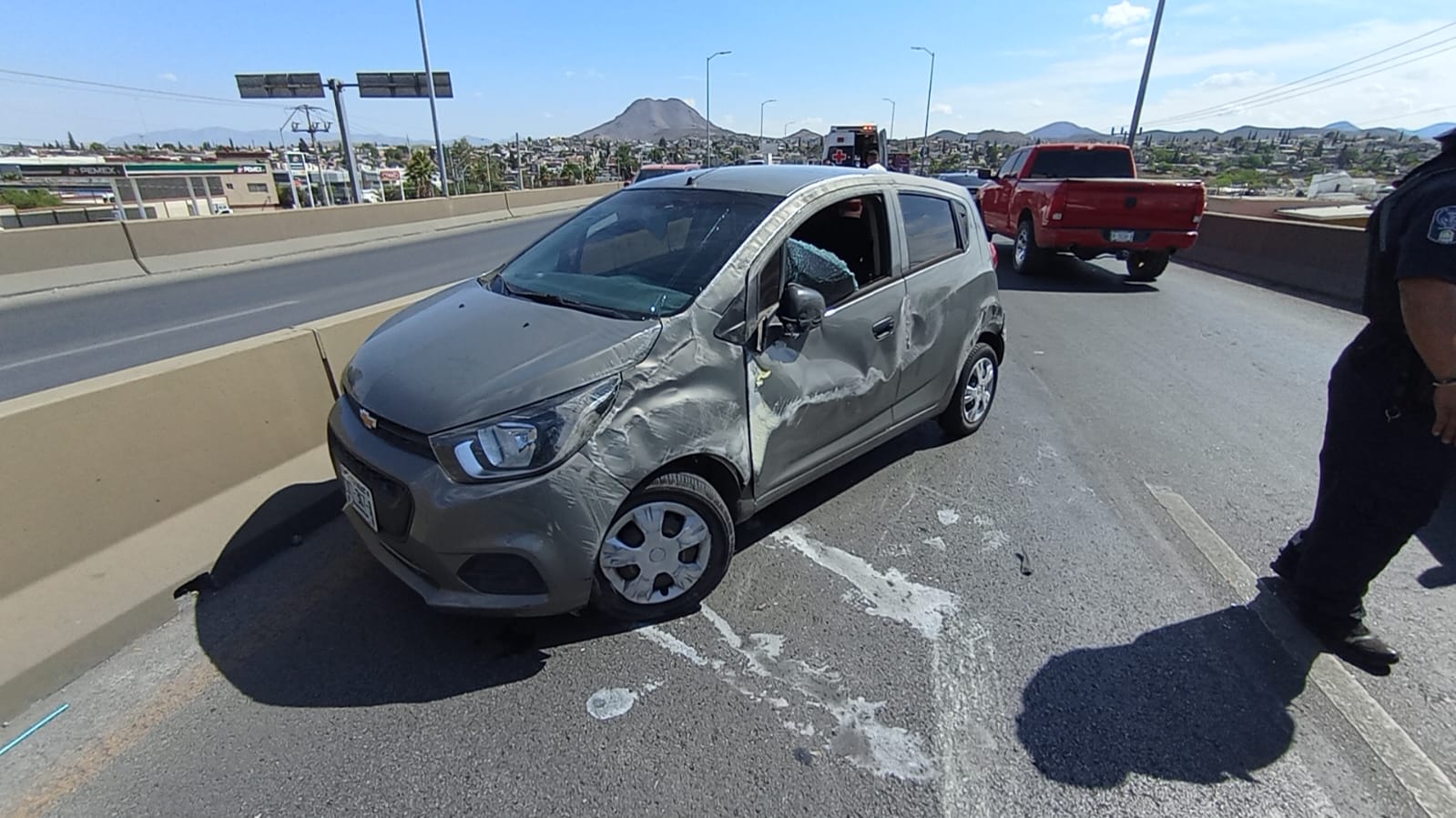 La primera de ellas ocurrió en el carril de norte a sur en el puente del Periférico de la Juventud que cruza el boulevard Antonio Ortiz Mena, donde la conductora de un vehículo Chevrolet, Spark, que viajaba junto con un menor de 3 años, perdió el control del volante, se impactó contra el muro de contención y volcó en su costado izquierdo.