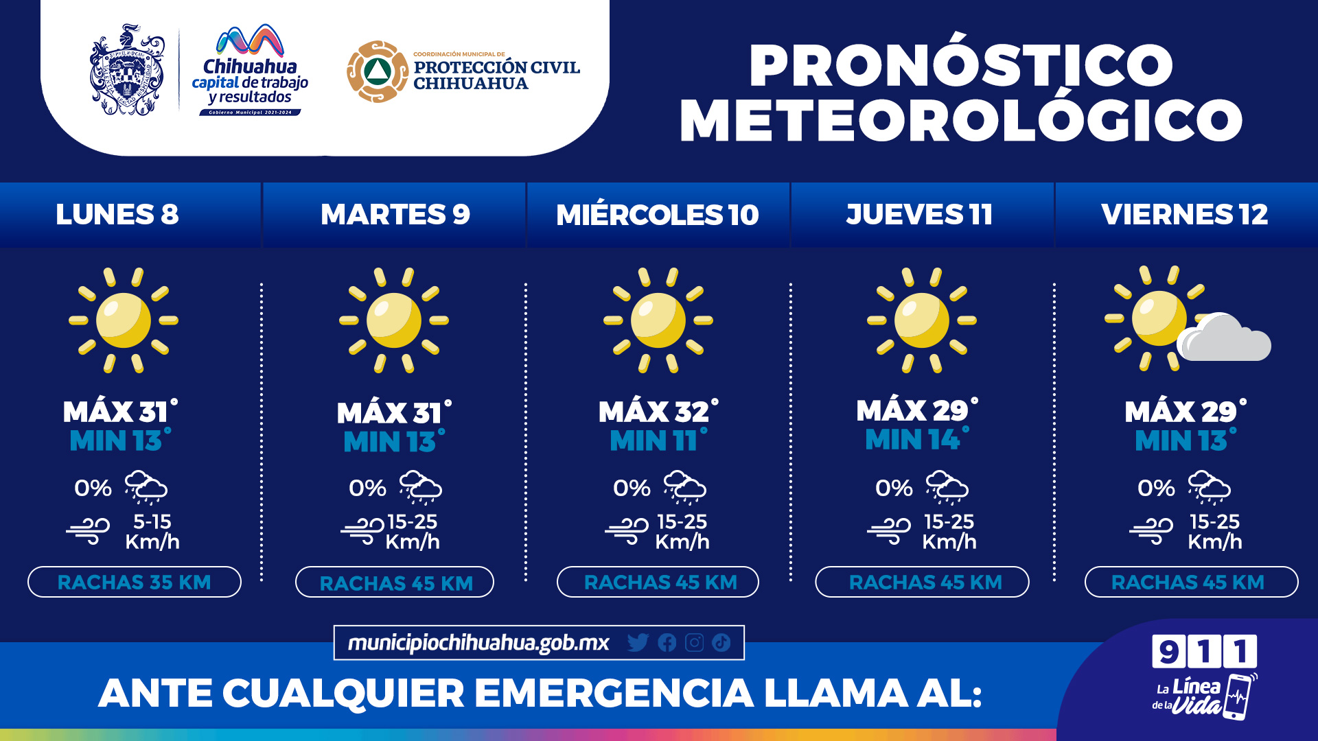 Chihuahua.- La Coordinación Municipal de Protección Civil, informa a la población que, para la semana del 08 al 12 de mayo, se pronostica que la temperatura alcance los 32°C, así como se esperan mañanas y noches frescas con mínimas de hasta 11°C.