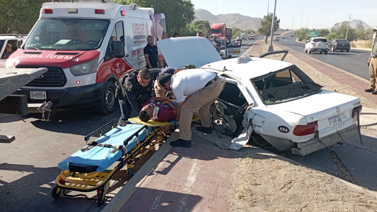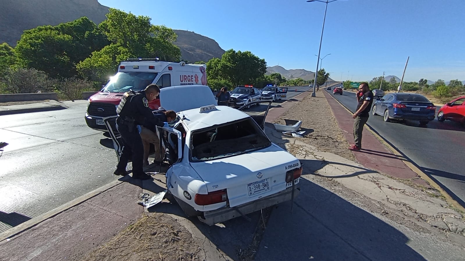 Chihuahua.- Vehículos de emergencia están detenidos sobre el carril izquierdo de la vialidad Sacramento, en sentido de sur a norte, a consecuencia de un fuerte choque de un taxi.