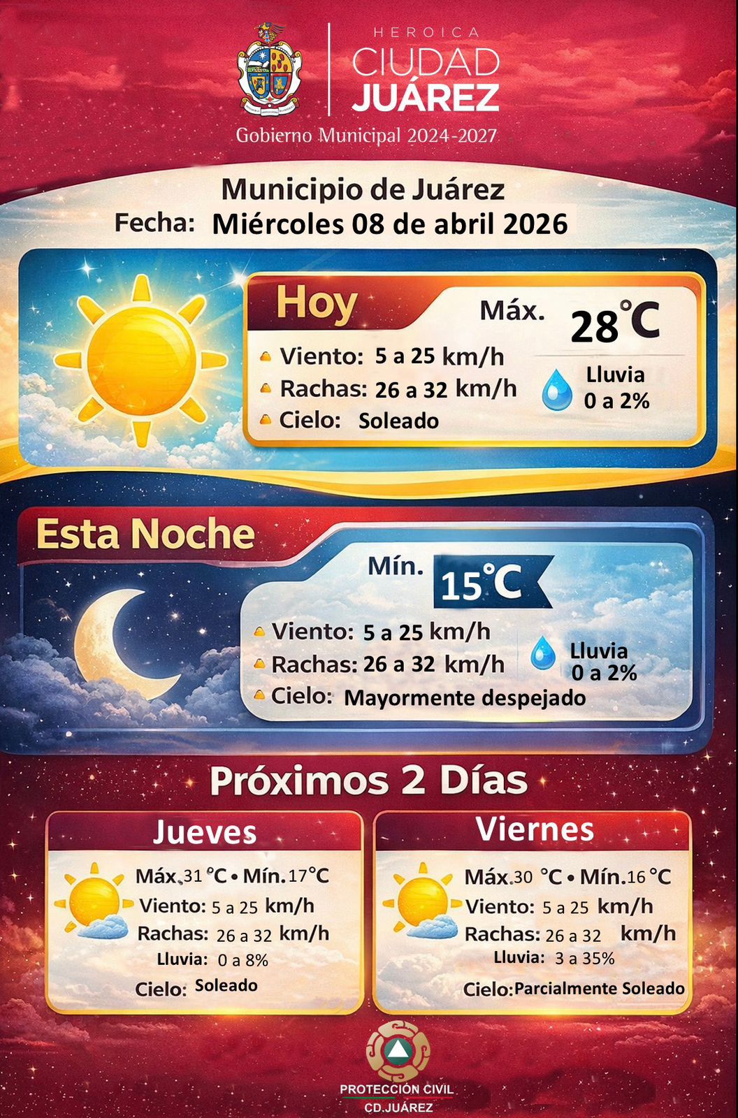 Juárez.- La Dirección General de Protección Civil del Municipio informó que para este miércoles 8 de abril se espera un día mayormente soleado, con una temperatura máxima de 28 grados centígrados y condiciones estables en la región.