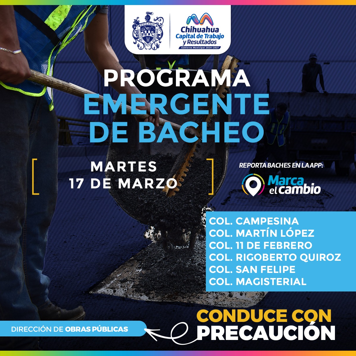 Chihuahua.- El Gobierno Municipal, a través de la Dirección de Obras Públicas, realizará trabajos de bacheo este martes 17 de marzo mediante el programa emergente en las calles de las colonias: Campesina, Martín López, 11 de Febrero, Rigoberto Quiroz, San Felipe y Magisterial.