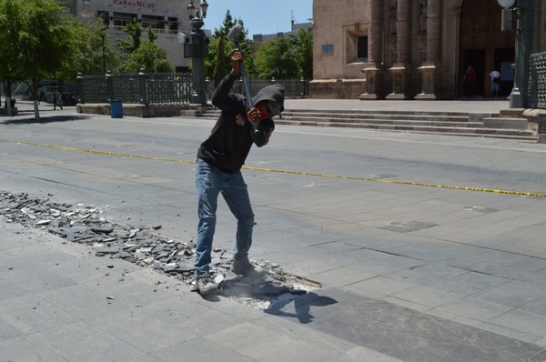 Personal de la Subdirección de Espacios Públicos es el encargado de realizar acciones de reparación en las canteras que se encuentra en la concurrida plaza, las cuales muestran un desgaste y se busca evitar cualquier incidente al paso de los ciudadanos en el emblemático lugar.