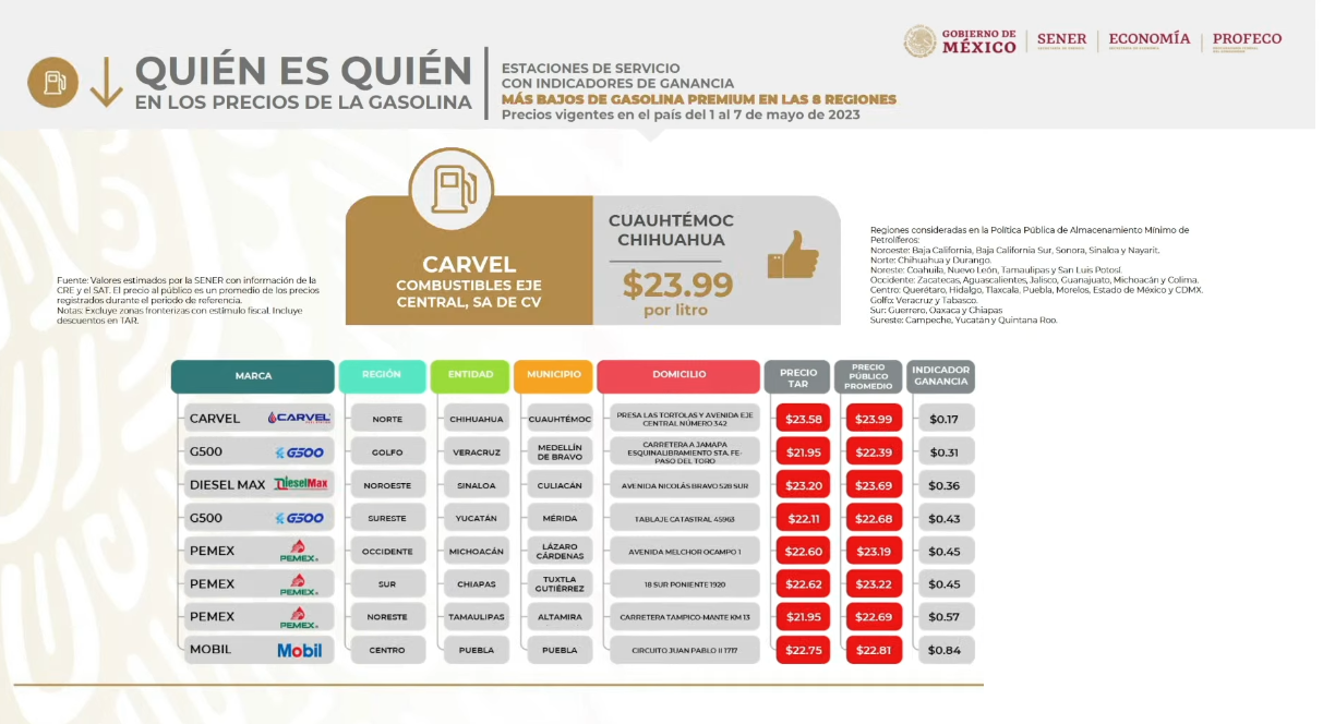 La estación de combustible se encuentra en la calle Presa las Tórtolas y avenida Eje Central, y de las 8 regiones de todo el país, es la que representa un margen de ganancia bajo, lo que beneficia directamente a los consumidores.