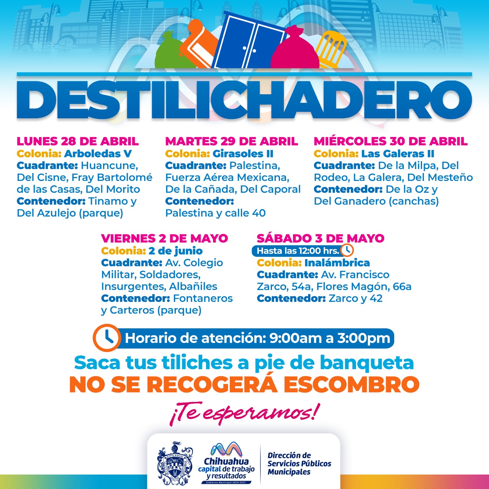 Chihuahua, Chih.- El Destilichadero consiste en retirar basura de grandes dimensiones que el camión recolector no puede trasladar, por lo que se pone a disposición de la población un contenedor en un punto fijo en un horario de 9:00 de la mañana a 3:00 de la tarde de lunes a viernes, mientras que el sábado de 9:00 am a 12:00 del mediodía.