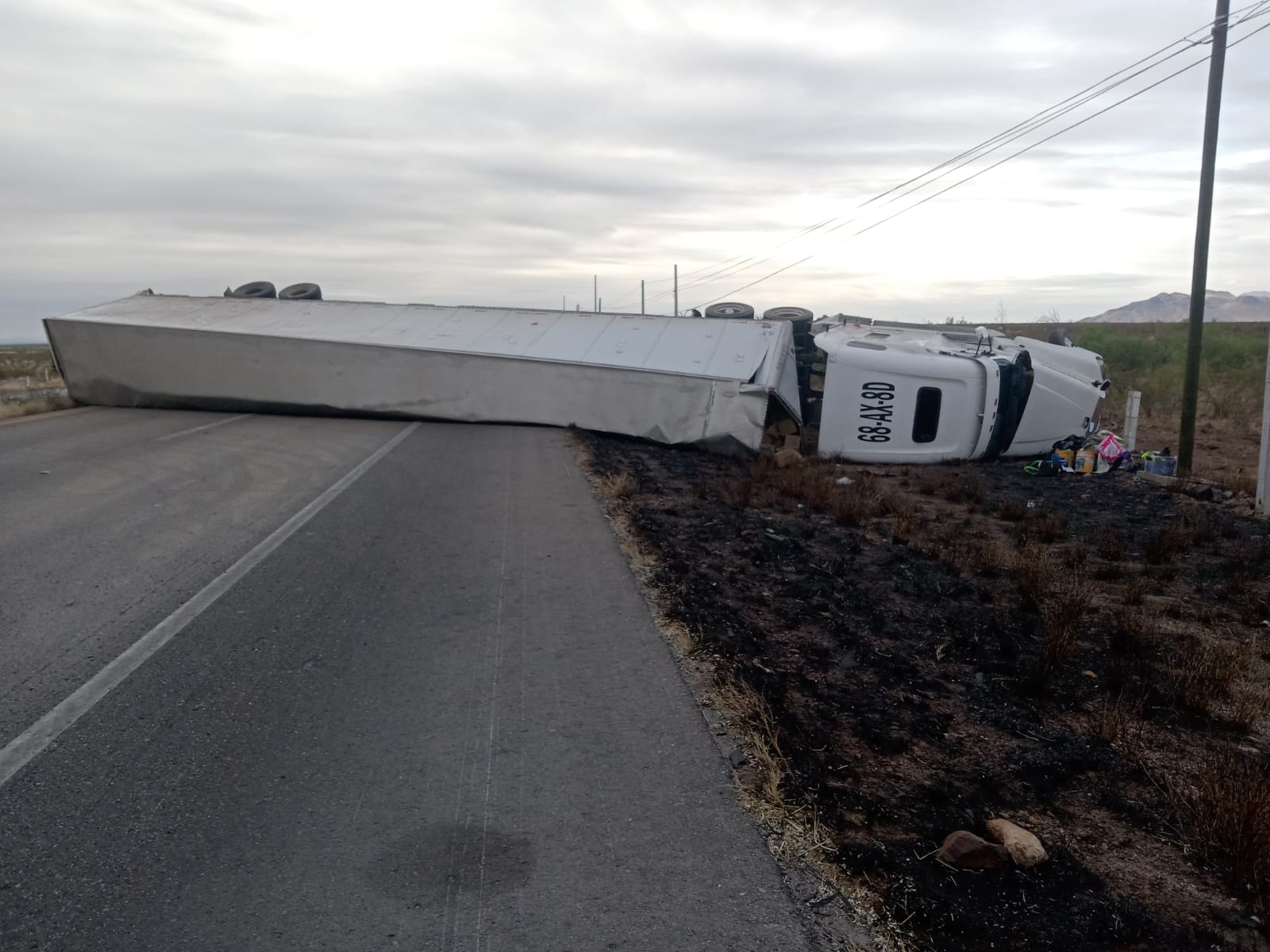 Chihuahua.- Una volcadura de tráiler se registró la mañana de este lunes en el kilómetro 175+200 la carretera Chihuahua-Delicias, en el carril de norte a sur.